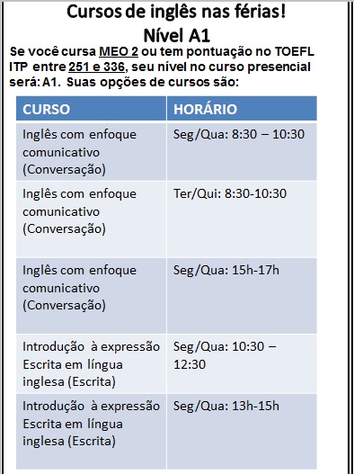 As modalidades ofertados são: Inglês com enfoque comunicativo (conversação), Introdução à expressão escrita em língua inglesa (escrita), Introdução à leitura de textos acadêmicos e Introdução aos exames internacionais de língua inglesa (Toefl/Ielts). Os alunos serão distribuídos conforme a nota obtida no Toefl ITP ou sua colocação no MEO.