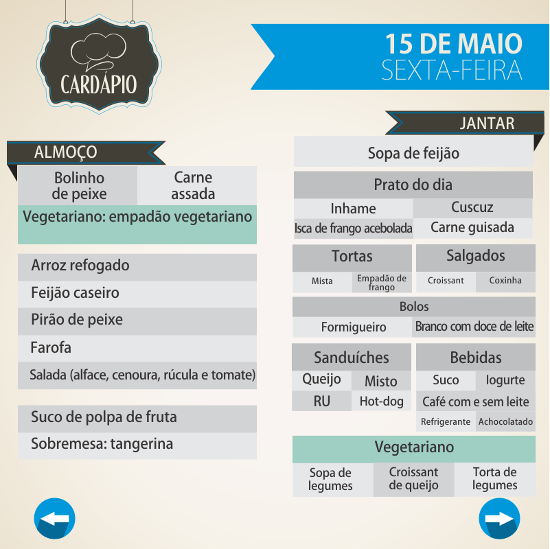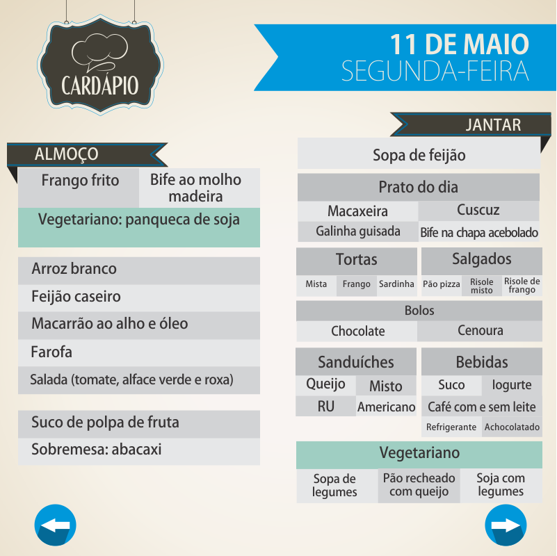 A Universidade Federal de Alagoas mudou a forma como disponibiliza o cardápio de almoços e jantares do Restaurante Universitário (RU). A partir desta semana, compreendida entre 11 e 17 de maio, o menu diário será publicado em imagens independentes para facilitar a visualização e compartilhamento. Para isso, também foi criado um álbum na página no Facebook.