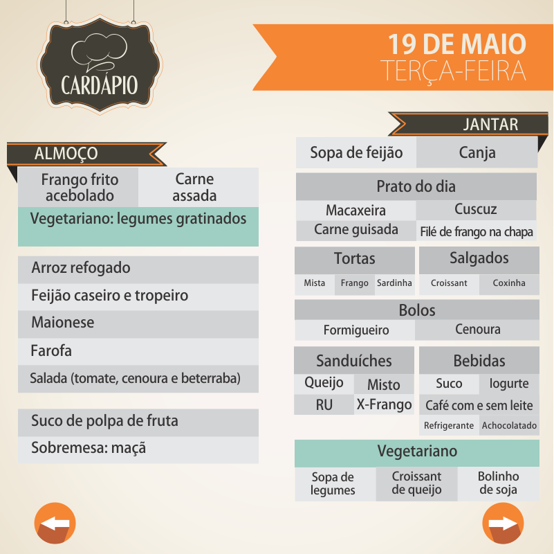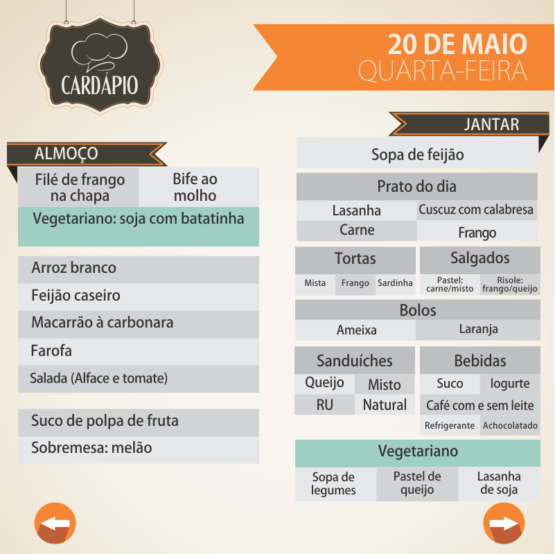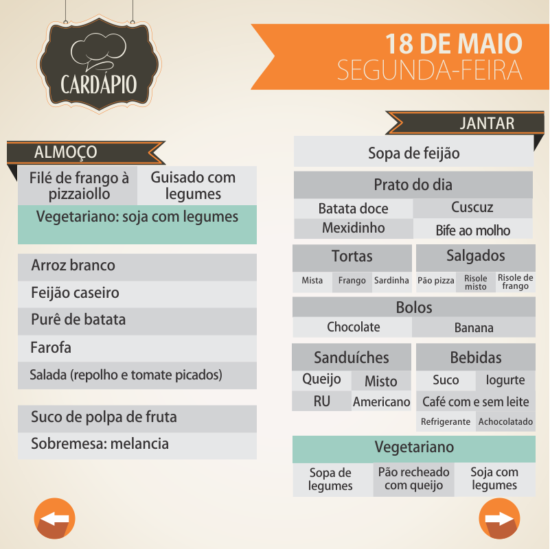 A Universidade Federal de Alagoas manteve a forma como disponibiliza o cardápio de almoços e jantares do Restaurante Universitário (RU), devido à boa receptividade da comunidade acadêmica. Sendo assim, o menu diário desta semana, de 18 a 23 de maio, continuará sendo publicado em imagens independentes para facilitar a visualização e compartilhamento. Para isso, também foi criado um álbum na página no Facebook.