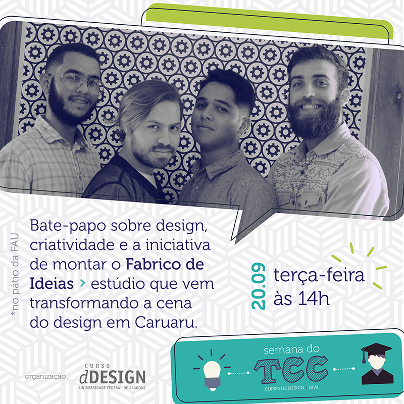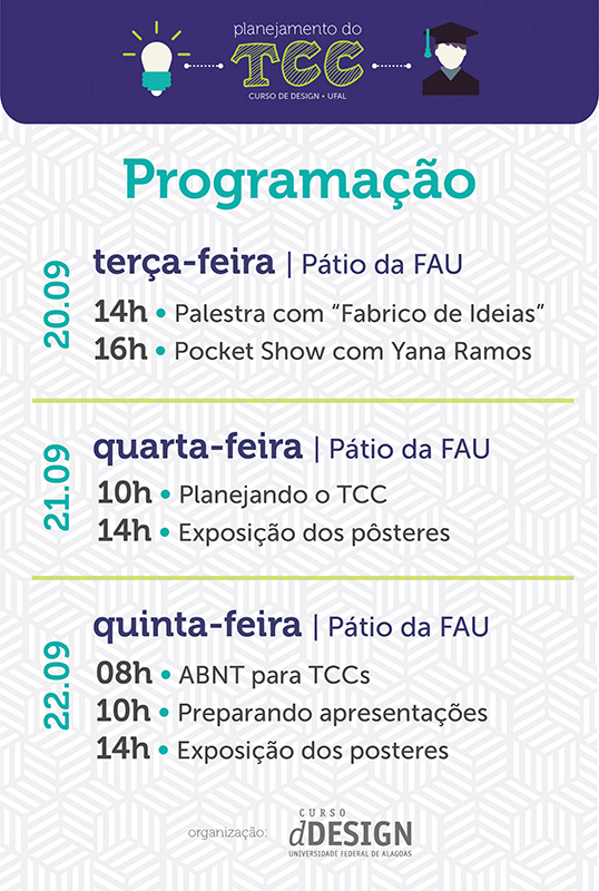 A coordenação do curso de Design da Ufal promove, até o dia 22, a Semana do TCC. De acordo com a organização, o evento acadêmico pretende ampliar a discussão sobre o tema entre alunos e professores, e debater acerca das expectativas de um Trabalho de Conclusão de Curso de Design. A iniciativa é para atender a uma demanda específica de estudantes que chegam ao final da graduação com muitas dúvidas, principalmente por ser um curso criado em 2011.