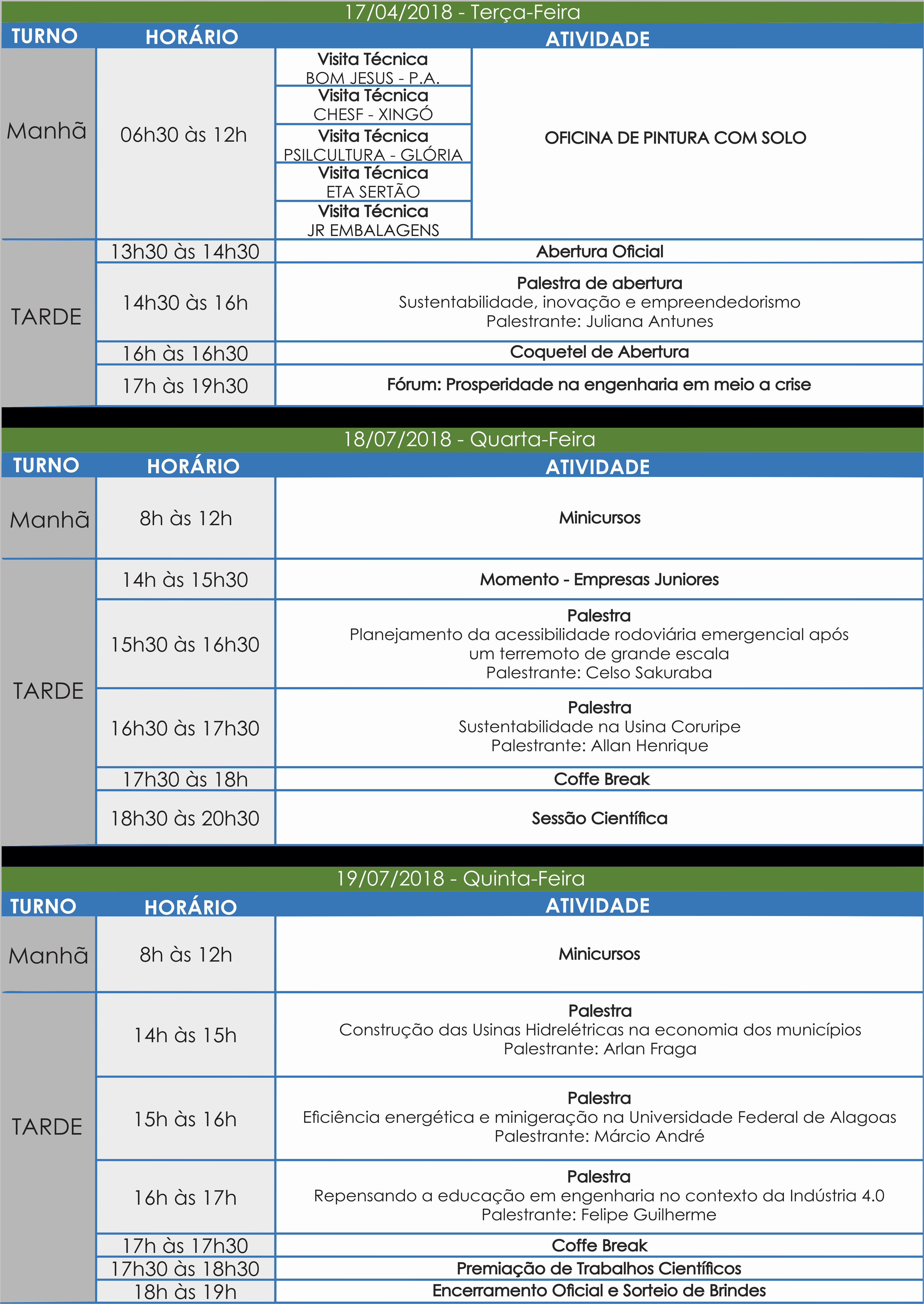 Os palestrantes confirmados para o evento são: Julianna Antunes (Mestranda em Engenharia de Produção pela COPPE/UFRJ, vencedora do Smart Living Challenge, programa veiculado ao governo da Suécia voltado para a sustentabilidade, e do prêmio mundial Go & Trade, do programa de empreendedorismo sustentável da Shell), Celso Sakuraba (Mestre em Engenharia de Produção – USP e Doutor em Ciência da Informação pela Universidade de Nagoya – Japão), Allan Henrique (Engenheiro de Produção e Coordenador Corporativo do Sistema de Gestão Integrada e Responsabilidade Social nas unidades de MG e AL da Usina Coruripe Açúcar e Álcool), Arlan Fraga (Engenheiro Elétrico pela UPE e atualmente é professor do IFBA e engenheiro eletricista da CHESF), Felipe Guilherme (Mestre e doutorando em Engenharia Industrial pela UFBA) e Marcio Andre (Mestre em Engenharia Civil pela UFAL e Doutor em Engenharia Civil pela Universidade de Virgínia).