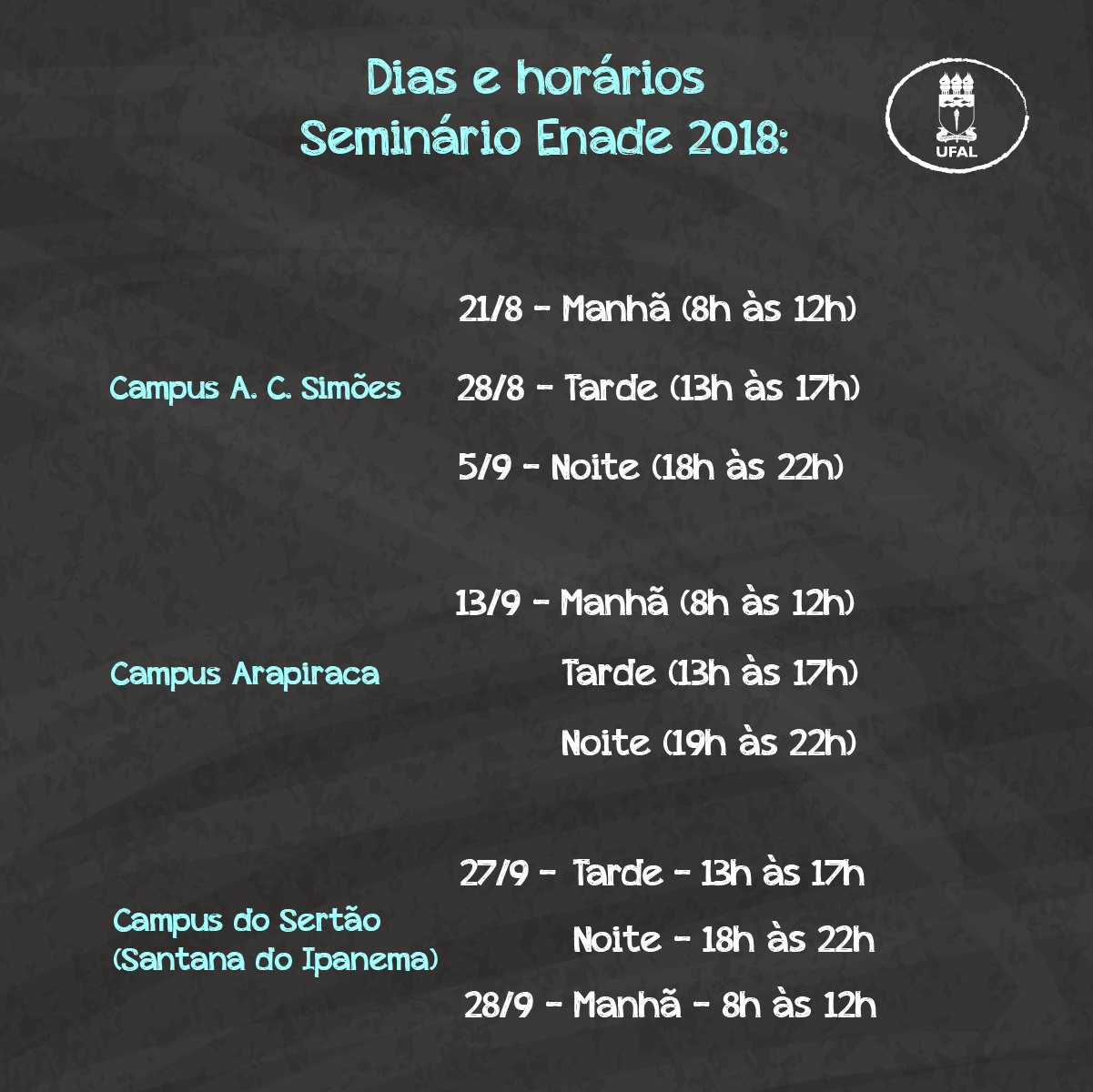 O Seminário Enade 2018 ocorrerá entre os dias 21 de agosto e 28 de setembro, nos campi A.C. Simões, Arapiraca e do Sertão, nos turnos manhã, tarde e noite, facilitando a participação de toda a comunidade acadêmica.