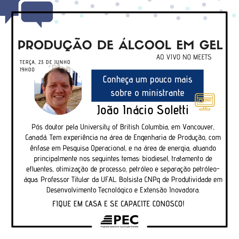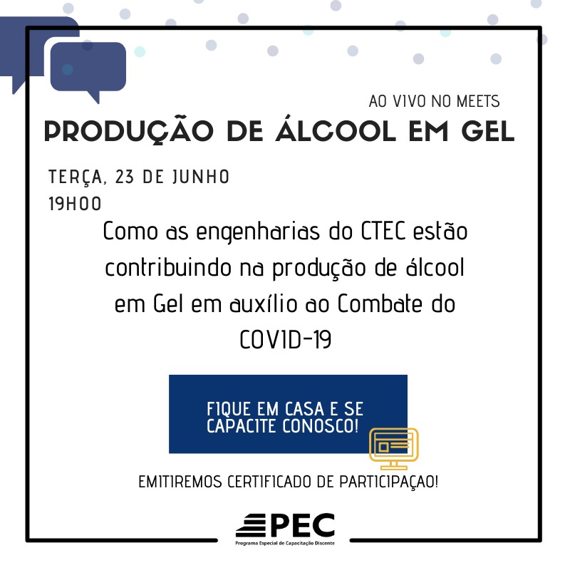 O Programa Especial de Capacitação Discente (PEC) realiza nesta terça (23), às 19h, o webnário Produção de Álcool e Gel. O impacto da COVID-19 é tão grande, que empresas produtoras de higienizantes importantes como álcool gel, álcool hidratado e hipoclorito, não estão conseguindo suprir a demanda, o que vem causando uma escassez desses produtos e aumento dos preços.