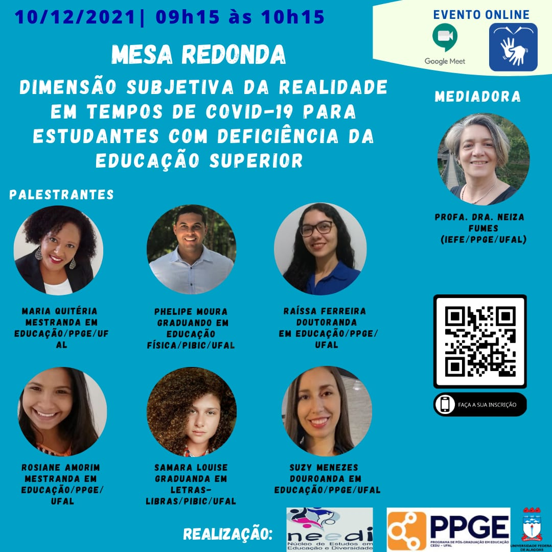 Durante o evento também serão discutidos a “Dimensão subjetiva da realidade na Educação Superior em tempos de covid-19 para estudantes com deficiência”, com mediação da professora Neiza Fumes e “Diálogos com universitários com deficiência sobre ensino remoto”, mediado pelo estudante Rinaldo Santos, do curso de Serviço Social da Ufal.