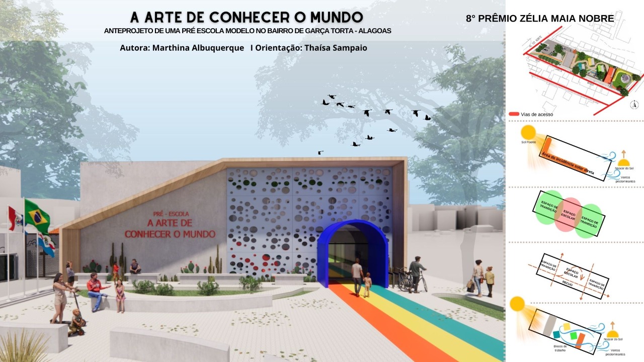 O trabalho de Marthina foi um anteprojeto arquitetônico de uma pré-escola modelo para crianças de 3 a 6 anos, de acesso público, situada no bairro de Garça Torta na cidade de Maceió – AL. A ideia é baseada numa pedagogia socioconstrutivista de Jean Piaget que atrela a arte educação e dá outro sentido à escola como território comunitário de aprendizagem.