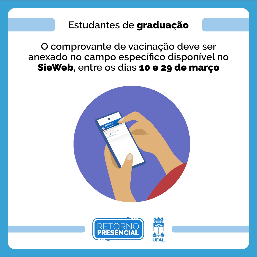Os estudantes da Universidade Federal de Alagoas (Ufal), que estão retomando as atividades presenciais a partir de21 de março – semestre 2021.2 - devem comprovar o esquema vacinal no Sie Web no período de 10 a 29 de março. As orientações estão publicadas na instrução normativa publicada no dia 25 de fevereiro deste ano.