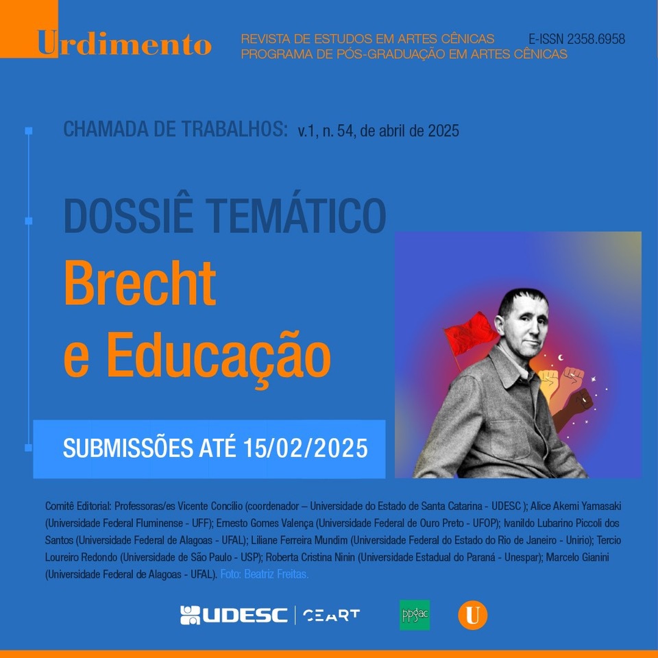 O 4º Fórum Brecht e Educação é uma realização do Grupo de Pesquisa do CNPq Brincantuar: artífices cênicos, vinculado ao curso de Teatro Licenciatura do Ichca, e da Escola Popular de Teatro Político de Alagoas (EPTPA), com apoio financeiro da Capes e parcerias com os Programas de Pós-Graduação em Artes Cênicas da Unirio e Udesc, com a UnB, USP, UFRJ e Grupo de Pesquisa do CNPq FiloMove, vinculado à Licenciatura em Filosofia do Ichca. Os anais do evento serão publicados num e-book e a Revista Urdimento, do PPGAC Udesc (Qualis A1), publicará uma edição com dossiê dedicado ao Fórum.