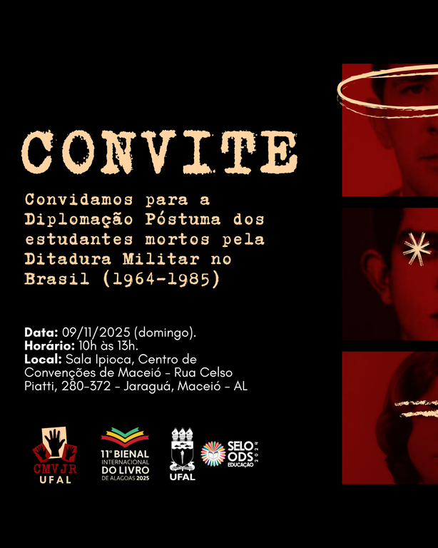 No domingo (9), a Universidade Federal de Alagoas (Ufal) realizará a diplomação póstuma de três estudantes perseguidos e mortos pela Ditadura Militar (1964-1985), na 11ª Bienal Internacional do Livro de Alagoas. A solenidade ocorrerá às 10h, na Sala Ipioca do Centro de Convenções de Maceió, e contará com a presença de familiares dos estudantes mortos, autoridades, comunidade acadêmica e membros da sociedade civil. O evento será gratuito e não precisa de inscrição prévia.