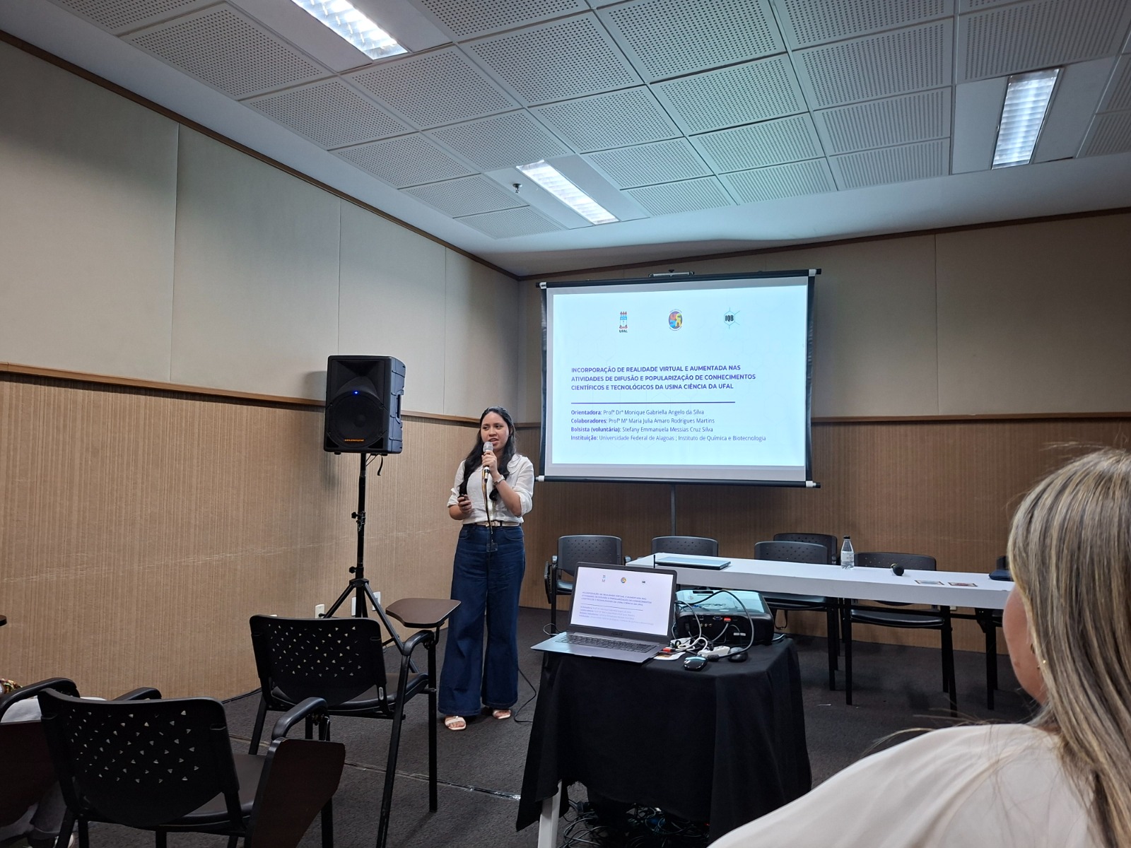 Stefany Messias, aluna de Química e orientanda da professora Monique no Programa Institucional de Bolsas de Iniciação em Desenvolvimento Tecnológico e Inovação (Pibiti), explicou a diferença entre realidade virtual imersiva, não imersiva, semi-imersiva e a colaborativa. A estudante, que desenvolve o projeto “Incorporação de realidade virtual e aumentada nas atividades de difusão e o popularização de conhecimentos científicos e tecnológicos da Usina Ciência da Ufal”, mostrou o potencial da utilização da realidade virtual em simulações na área da medicina, no uso na arquitetura e na engenharia, ressaltando que na Educação também há espaço para essa técnica. “Na Educação, a realidade virtual não fica para trás. A nossa proposta é trazer a realidade virtual, a realidade aumentada para os shows de Química, fazendo interação com o estudante”, disse.
