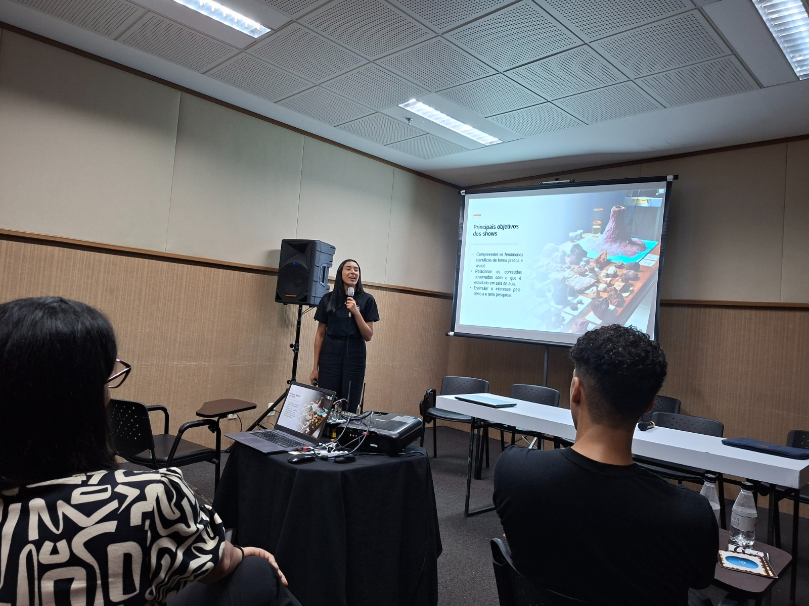 Letícia Ferreira Rocha, uma das monitoras de Geografia e Astronomia falou sobre a experiência com os visitantes e sobre o processo para levar alguns dos elementos utilizados nos shows. “As crianças e os adultos adoram a sala de Astronomia. O nosso foco é compreender os fenômenos científicos de forma prática e visual. Parte do material de Geografia que temos hoje, a gente precisou ir a campo, fazer análise. Fizemos também um vulcão, que quando as crianças entram na sala, é a primeira coisa que veem, vão para a mesa, mexem nele”, contou