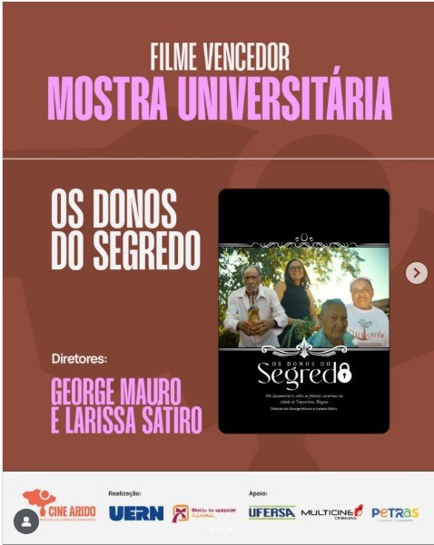 A valorização do saber popular no uso de plantas medicinais foi tema do Trabalho de Conclusão de Curso (TCC) de George Mauro, então graduando de Ciências Biológicas do Campus Arapiraca da Universidade Federal de Alagoas, em 2024. O documentário, intitulado “Os Donos do Segredo”, ultrapassou o âmbito acadêmico, integrando diversos festivais e recebendo, recentemente, o prêmio de Melhor Filme da Mostra Universitária no Festival de Cinema do Semiárido, em Mossoró, Rio Grande do Norte.