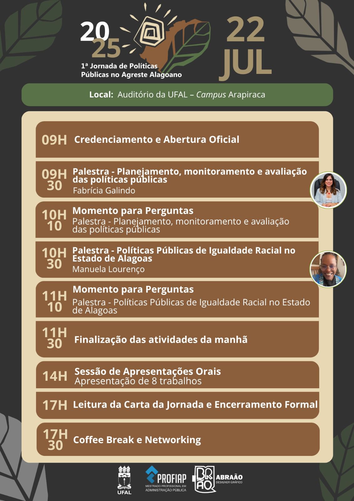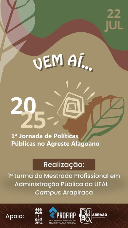 A 1ª Jornada de Políticas Públicas no Agreste Alagoano conta com o apoio institucional da Ufal e do Profiap, além da colaboração do designer gráfico Abraão, responsável pela identidade visual.