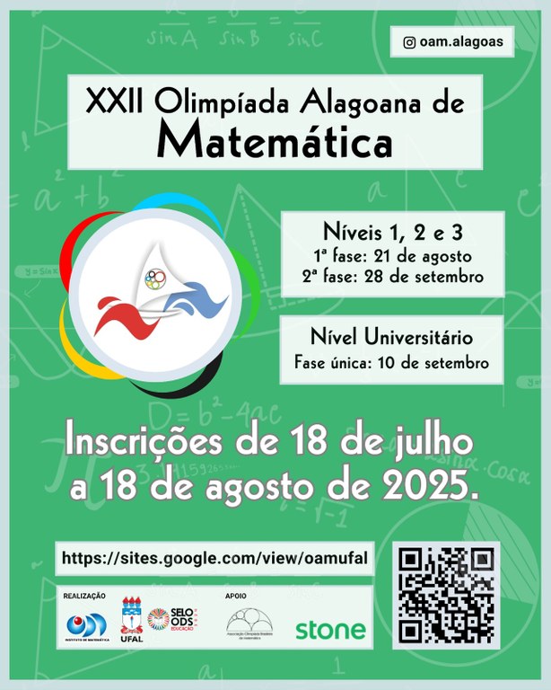 As inscrições para a 22ª edição da Olimpíada Alagoana de Matemática (OAM) estarão abertas de 18 de julho a 18 de agosto. A competição é organizada pela Universidade Federal de Alagoas (Ufal) desde 2003 e aberta para estudantes matriculados em escolas, instituições e universidades do estado.