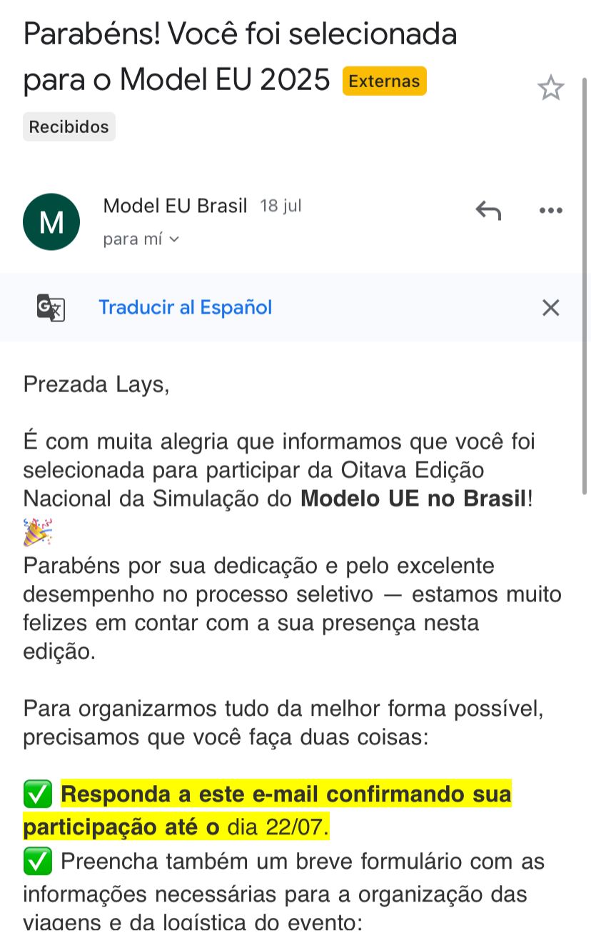 Além do currículo, a estudante também elaborou uma carta de intenção, na qual explicou os motivos que a levaram a querer participar da Model UE Brazil. “Por fim, respondi a algumas perguntas sobre meu nível de inglês, minhas vivências na Universidade e o que já aprendi sobre a União Europeia ao longo da minha trajetória. Foi uma experiência muito enriquecedora desde o processo seletivo", comemora Lays a conquista e a oportunidade de viver a experiência.
