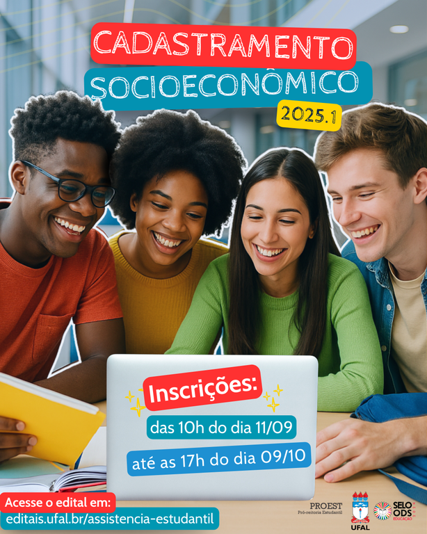 A Universidade Federal de Alagoas (Ufal), por meio da Pró-reitoria Estudantil (Proest), lançou o edital do Cadastramento Socioeconômico para o semestre letivo de 2025.1. O processo é voltado para estudantes ingressos em todos os cursos de graduação na modalidade presencial e em situação de vulnerabilidade social. As inscrições estarão abertas a partir das 10h do dia 11 de setembro, até as 17h do dia 9 de outubro. o link para inscrição ainda não está disponível.