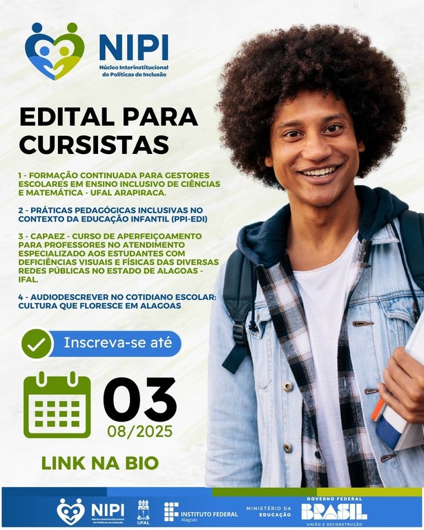 Com o objetivo de promover práticas mais inclusivas na educação básica, o Núcleo Interinstitucional de Políticas de Inclusão (Nipi), uma iniciativa conjunta entre a Universidade Federal de Alagoas (Ufal) e o Instituto Federal de Alagoas (Ifal), está oferecendo cursos gratuitos de formação continuada. As inscrições terminam neste domingo, 3 de agosto, e podem ser feitas de forma on-line, pelo link.