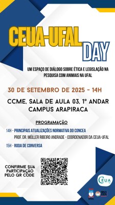 A Comissão de Ética no Uso de Animais (CEUA) da Universidade Federal de Alagoas (Ufal) realiza na terça-feira (30), às 14h, o Ceua-Ufal Day, no Campus Arapiraca (sala de aula 3, 1º andar). O encontro tem como objetivo promover um espaço de diálogo com docentes, técnicos e pesquisadores sobre a ética no uso de animais em atividades de ensino e pesquisa. A programação inclui esclarecimentos sobre as principais normativas do Conselho Nacional de Controle de Experimentação Animal (Concea), orientações sobre a regularização de instalações e projetos, além da apresentação do funcionamento da própria comissão.