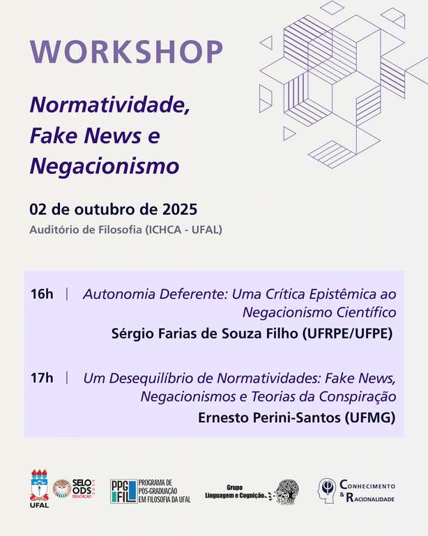 O Programa de Pós-Graduação em Filosofia (PPGFIL) da Universidade Federal de Alagoas (Ufal) realizará o ‘Workshop de Normatividade, Fake News e Negacionismo’. O evento será realizado na tarde do dia 2 de outubro, no Auditório de Filosofia, localizado no Instituto de Ciências Humanas, Comunicação e Artes (Ichca), Campus A.C. Simões da Ufal, em Maceió. Não é preciso se inscrever previamente para poder participar.