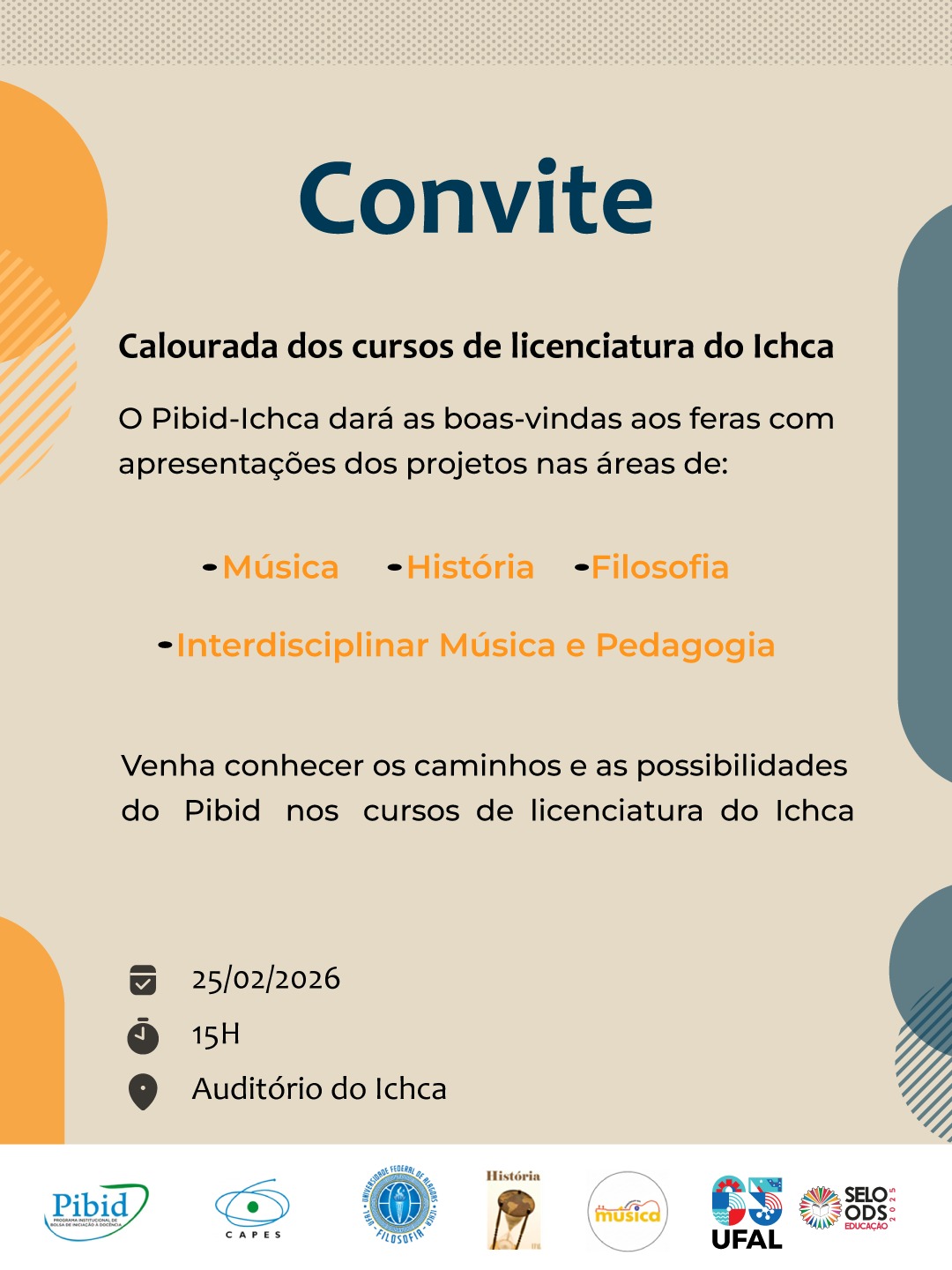 O Instituto de Ciências Humanas, Comunicação e Arte (ICHCA) preparou uma calourada conjunta para os cursos de licenciatura em Música, Teatro, História, Filosofia e Interdisciplinar em Música e Pedagogia. No dia 23 de fevereiro, às 19h, tem recital do professor José Fagundes.