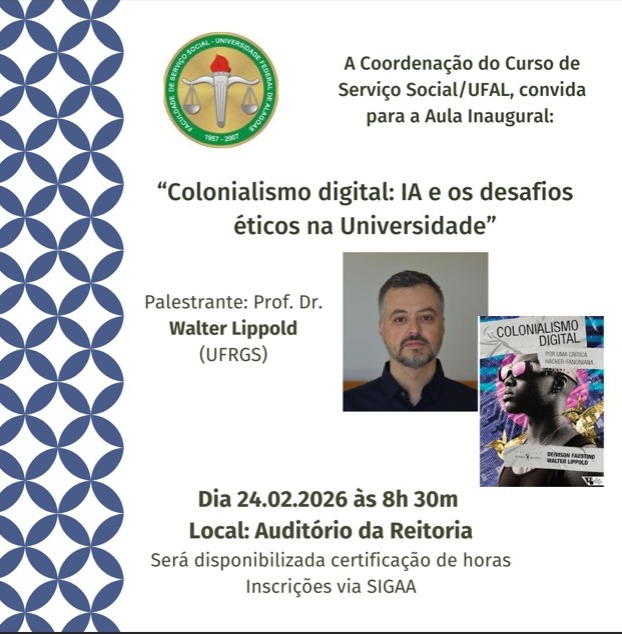 Na Faculdade de Serviço Social (FFSO/Ufal), os calouros vão ter programação a semana inteira, a partir do dia 23 de fevereiro, às 8h. Encontro com a coordenação e lanche coletivo são só uma prévia do que vem por aí. A coordenação do curso promove já na terça-feira (24), duas aulas inaugurais. Abertas para estudantes de todos os cursos, os eventos acontecerão no auditório da Reitoria e terão emissão de certificado de horas. As inscrições podem ser feitas através do Sigaa ou presencialmente, pouco antes do horário de início. A primeira aula acontece pela manhã, às 8h30, quando o professor Walter Lippold (UFRGS) ministra a palestra “Colonialismo digital: IA e os desafios éticos na Universidade”. Doutor em História, o pesquisador atua em estudos sobre colonialismo digital, história da tecnologia, cibercultura e hacktivismo, além de integrar grupos de pesquisa na Universidade Federal Fluminense (UFF) e na Universidade Federal de São Paulo (Unifesp), sendo também autor do livro Colonialismo digital. Já à noite, às 19h, a professora Silvia Lema, docente da Universidad de la República (UdelaR), apresenta a conferência “O Serviço Social no contexto da crise estrutural: desafios e oportunidades”, trazendo reflexões a partir de sua atuação em políticas sociais, extensão universitária e metodologias participativas voltadas ao trabalho e à produção da vida social. Veja mais aqui.