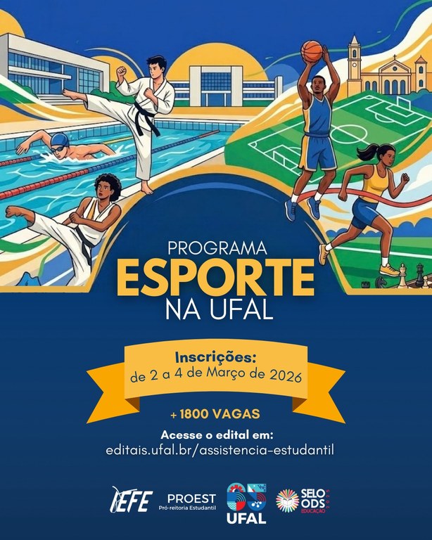 O Programa Esporte na Ufal tem o objetivo de trazer qualidade de vida para os estudantes por meio de práticas esportivas. No total, serão ofertadas 1.022 vagas, distribuídas em 26 modalidades, no Campus A.C. Simões; 620 vagas, em 12 modalidades, para o Campus Arapiraca; e 162 vagas para o Campus do Sertão.
