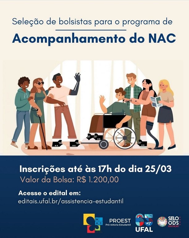 Estão abertas, até às 17h do dia 25 de março, as inscrições para o processo seletivo simplificado de bolsistas do Núcleo de Acessibilidade (NAC) – Acompanhamento, da Universidade Federal de Alagoas (Ufal), no Campus A. C. Simões. A seleção é voltada para estudantes de graduação presencial interessados em atuar no apoio à inclusão, permanência e aprendizagem de alunos com deficiência, Transtorno do Espectro Autista (TEA) e altas habilidades/superdotação.
