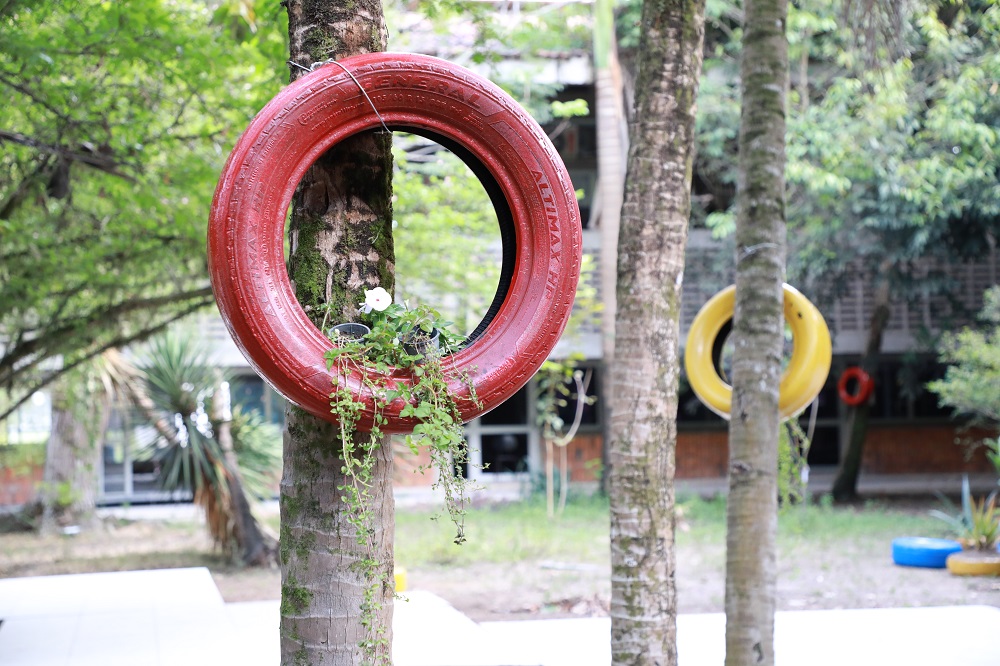 Pneus coloridos despojados pelo chão com flores naturais preenchendo-os, além de plantas medicinais, condimentar e alimentar são os materiais que compõem a ornamentação e dividem espaço entre as demais árvores da área. A servidora Valéria Coelho explica que a ideia veio a pedido da Gestão e que a intenção inicial era ornamentos natalinos ecologicamente sustentável, substituindo os tradicionais adereços artificiais e poluidores, a proposta foi ampliada para algo que pudesse ficar permanente com a revitalização do pátio da Reitoria explorando a reciclagem e reutilização de materiais.