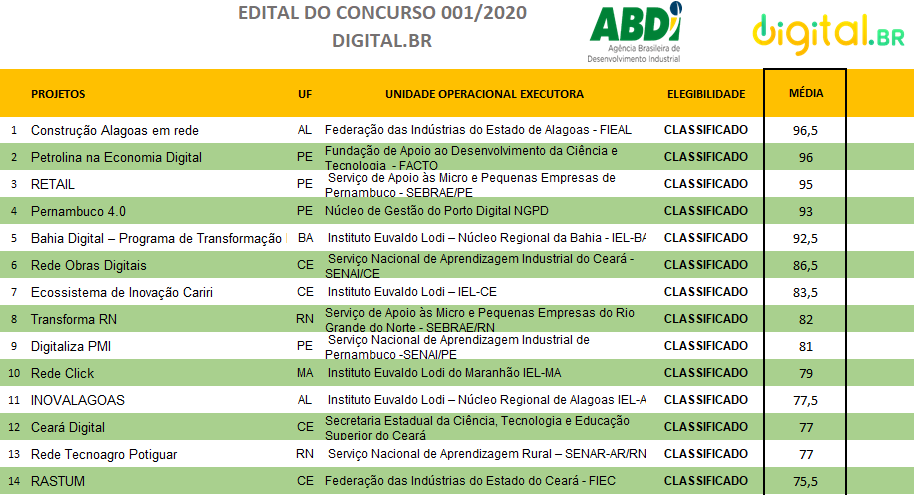 A bagagem de conhecimento e a experiência com inovação são alguns dos destaques para a Universidade Federal de Alagoas incluir seu nome em dois projetos aprovados no edital do programa Digital.br. A iniciativa da Agência Brasileira de Desenvolvimento Industrial (ABDI) contemplou os trabalhos para receber apoio técnico e financeiro com o objetivo de acelerar projetos propostos por redes e ecossistemas de inovação que tenham como beneficiárias empresas de micro, pequeno ou médio portes, localizadas na região Nordeste.