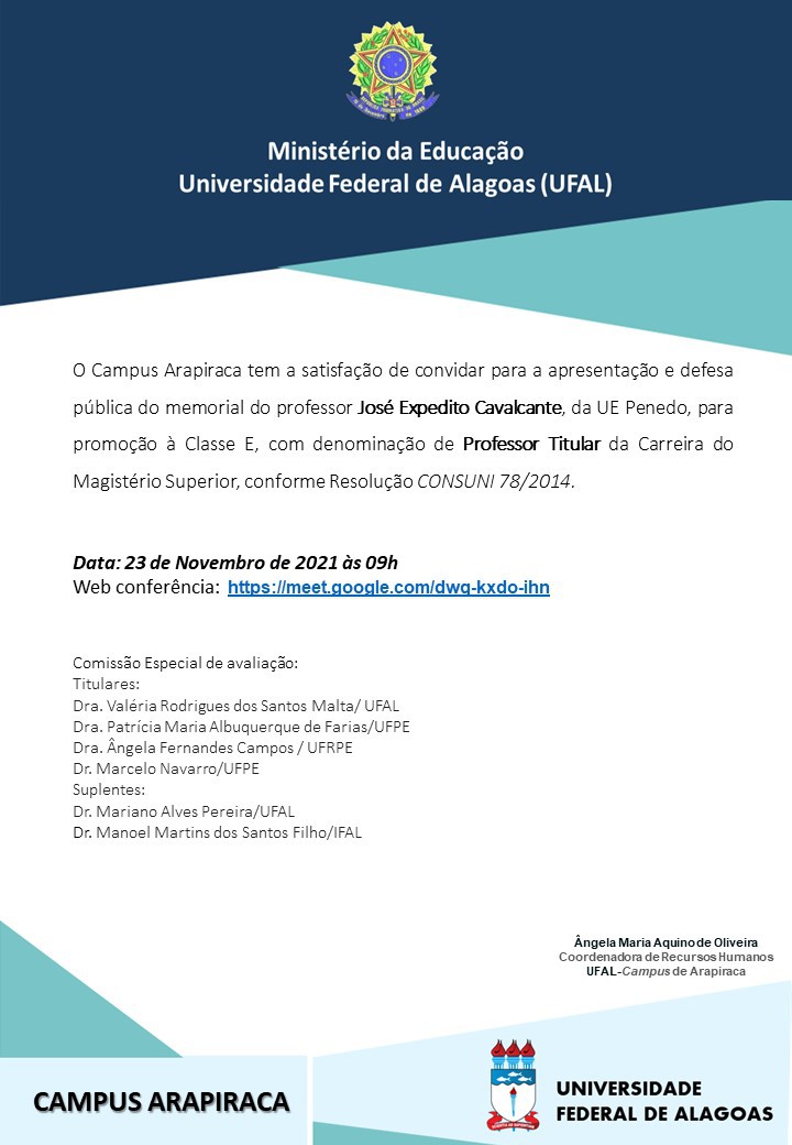 O professor José Expedito Cavalcante é o primeiro docente titular do Campus Arapiraca, da Universidade Federal de Alagoas (Ufal). A defesa do memorial, que aconteceu virtualmente devido à pandemia de covid-19, e é requisito para o processo de promoção, aconteceu no último dia 23 de novembro. Neste ano em que a Ufal completa 60 anos, o professor enfatiza que a promoção foi um marco na sua história. “A defesa do memorial acadêmico é um dos momentos mais importantes para um docente do magistério superior”, explica o professor Expedito.