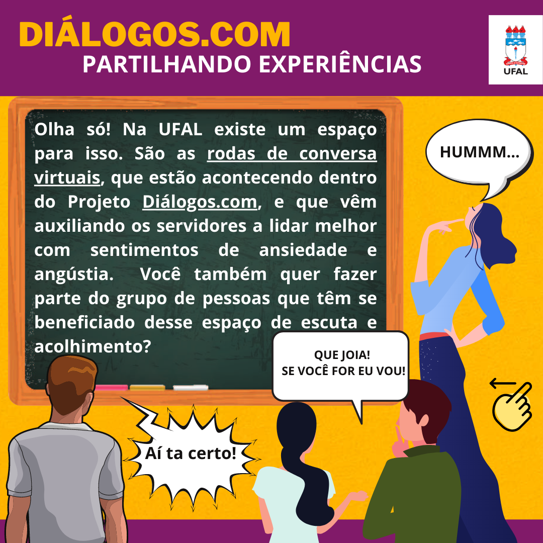 Mensalmente a Pró-reitoria de Gestão de Pessoas e do Trabalho (Progep) da Ufal, por meio da equipe multiprofissional do Subsistema Integrado de Atenção à Saúde do Servidor (SIASS) e da Coordenação de Qualidade de Vida (CQVT) realiza encontro virtual para servidores. O Diálogos.com este mês, acontece em duas datas, nos dias 13 e 29 de abril, às 15h30 e às 9h30 respectivamente.