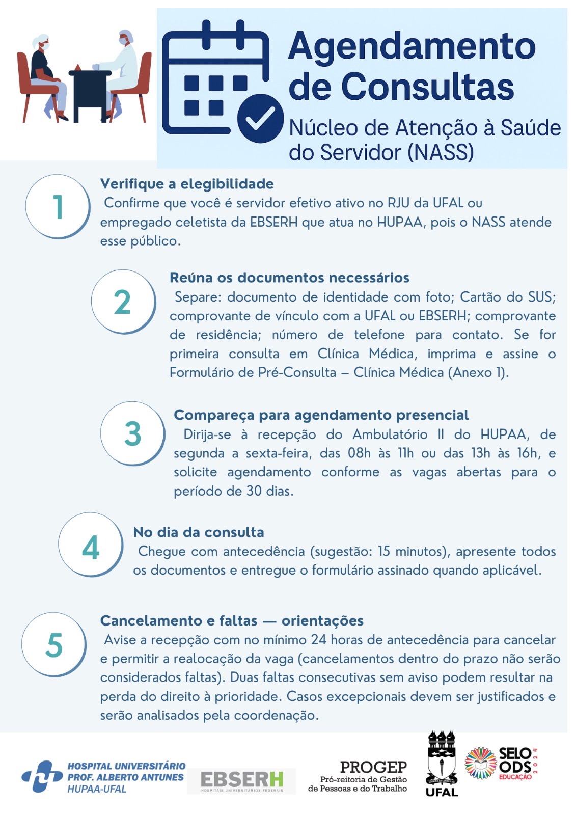 O NASS alerta que ausências não justificadas em duas consultas consecutivas implicam na perda de prioridade no agendamento. Já os cancelamentos devem ser comunicados com, no mínimo, 24 horas de antecedência, permitindo que a vaga seja disponibilizada para outro servidor.