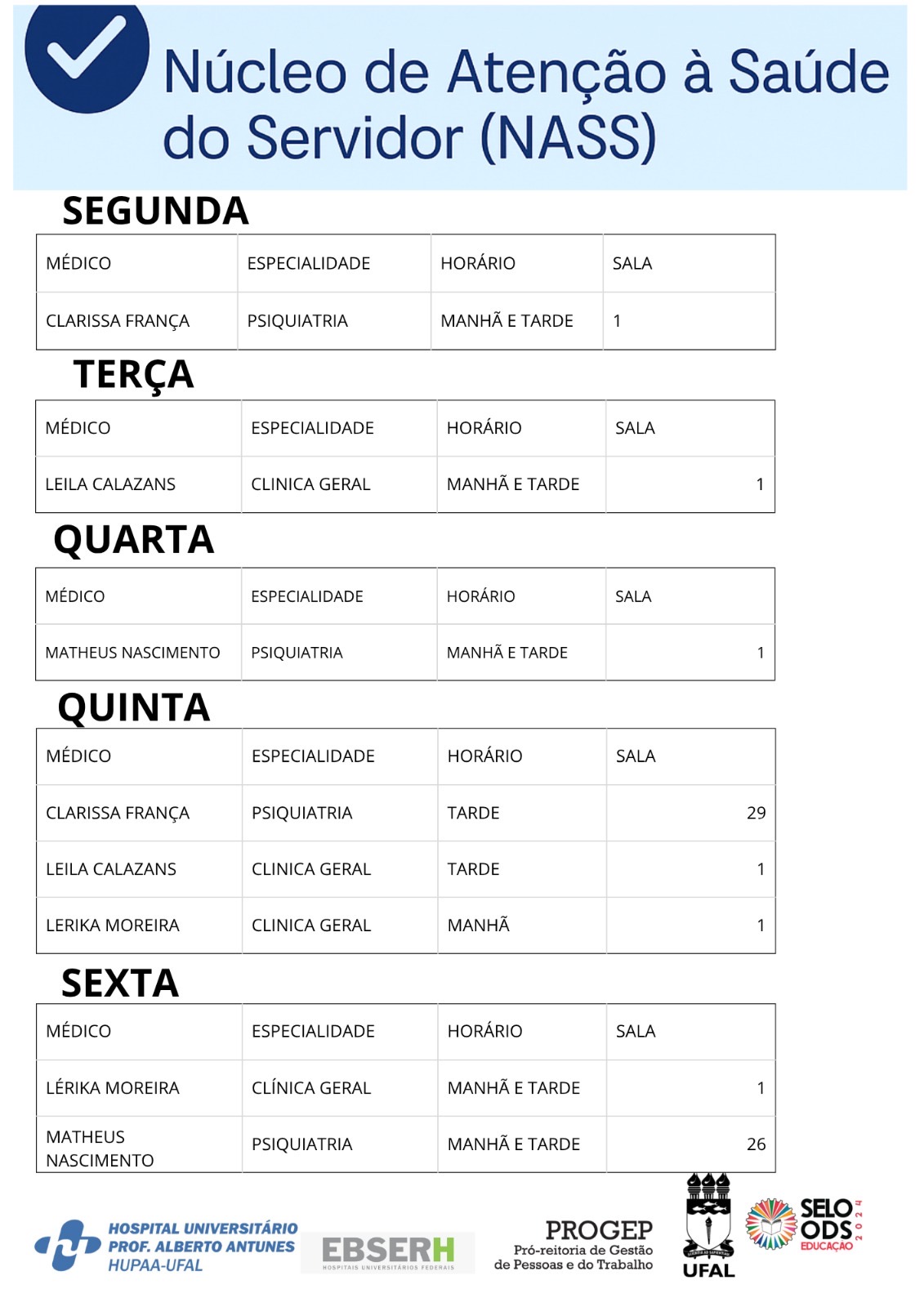 O Nass atenderá servidores da Universidade, ativos e aposentados, e da Ebserh e as consultas serão realizadas por dois psiquiatras e dois clínicos gerais, lotados na Progep. No entanto, as atividades do ambulatório estão sendo realizadas em uma sala cedida pelo HU. “Estamos dando todo o suporte para o serviço até que ele se ajuste e se estabeleça de vez na Universidade, pelo espaço e pela expertise do Hospital Universitário no atendimento e acolhimento das pessoas”, complementou Rodrigues.