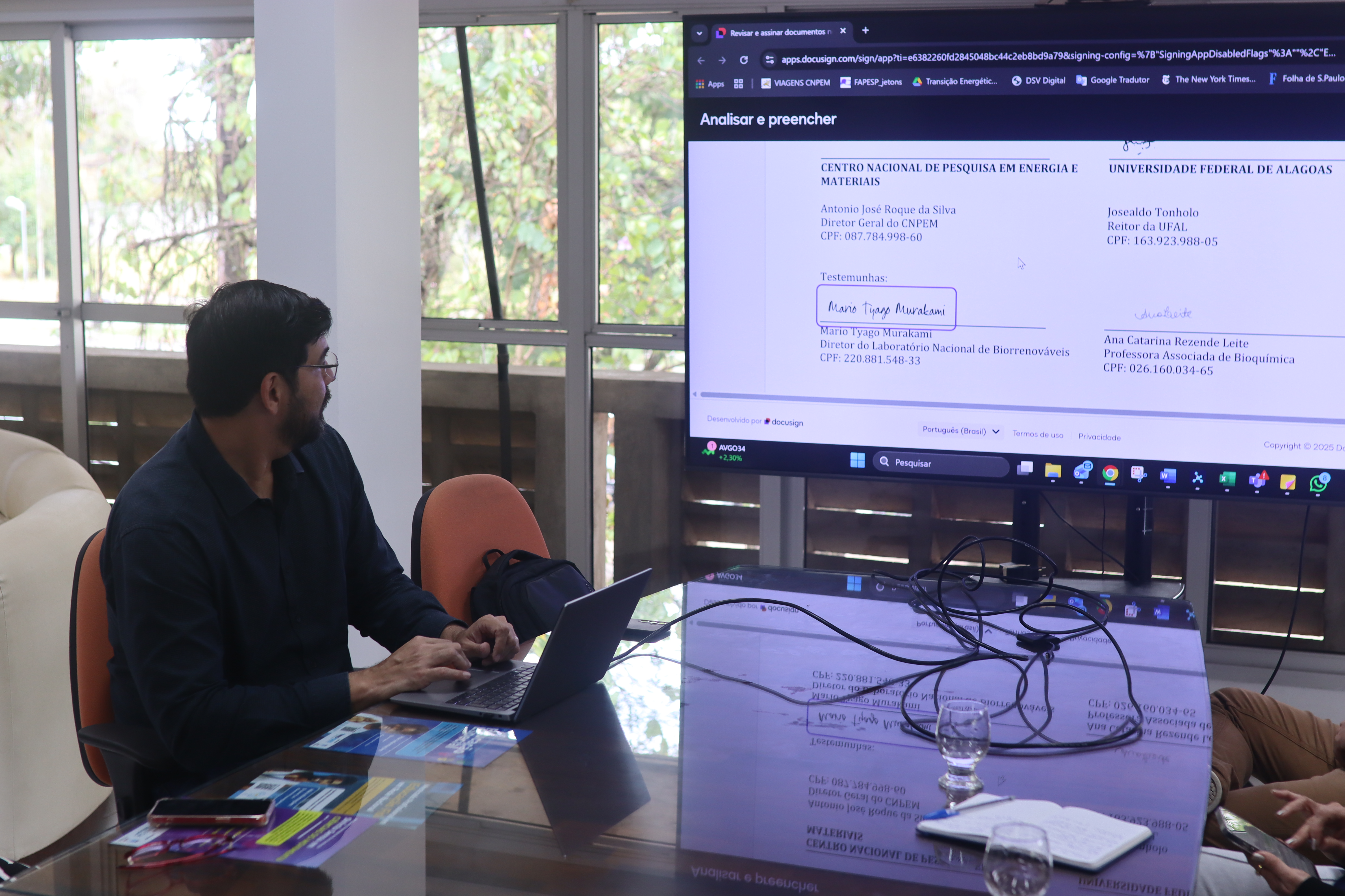 Participaram da solenidade de assinatura o reitor da Ufal, Josealdo Tonholo; o diretor do Laboratório Nacional de Biorrenováveis (LNBR), Mário Tyago Murakami; a professora do Programa de Pós-Graduação em Química e Biotecnologia (PPGQB/Ufal), Ana Catarina Leite; o diretor do Instituto de Química e Biotecnologia (IQB), Thiago Mendonça de Aquino; o coordenador do PPGQB, Edeildo Ferreira da Silva Júnior, o professor do Rede Nordestina de Biotecnologia (Renorbio) Euzébio Santana, e o embaixador do CNPEM na Ufal, o professor do IF, David Sampaio.