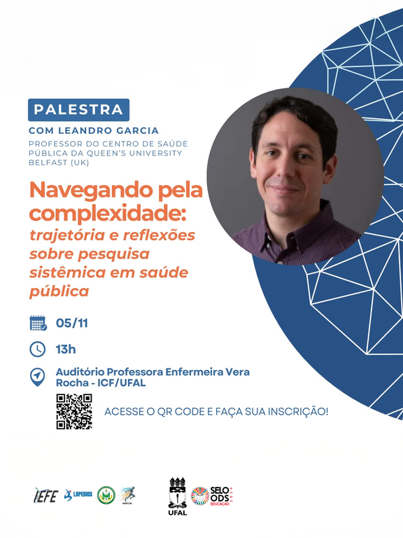 O Instituto de Educação Física e Esporte (Iefe/Ufal) vai receber o professor do Centro de Saúde Pública da Queen's University Belfast (Reino Unido), Leandro Garcia, no dia 5 de novembro. O pesquisador vai realizar a palestra intitulada Navegando pela complexidade: trajetória e reflexões sobre pesquisa sistêmica em saúde pública no auditório Professora Vera Rocha, no Instituto de Ciências Farmacêuticas (ICF/Ufal).