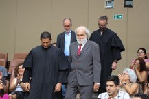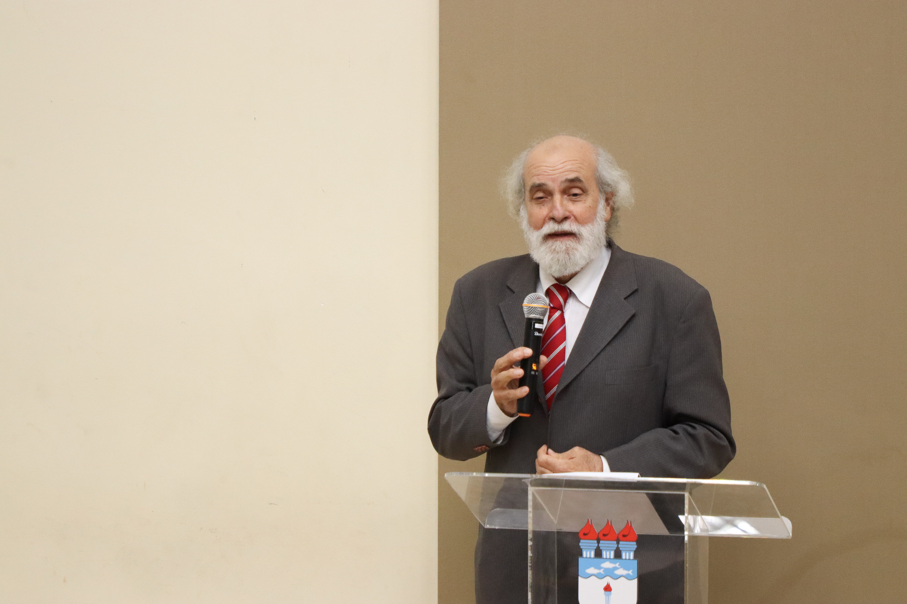 “Eu quero agradecer essa grande honra. Minha gratidão a Deus, aos meus pais, aos meus irmãos, minha mulher e colega, nossos filhos, nossas noras, ao nosso genro e aos nossos netos. Minha gratidão a grandes mestres, com meu próprio pai, que foi professor de filosofia da Universidade Federal da Bahia, professor este que me ensinou muito. Ao nosso reitor Josealdo Tonholo”, iniciou Jenner.