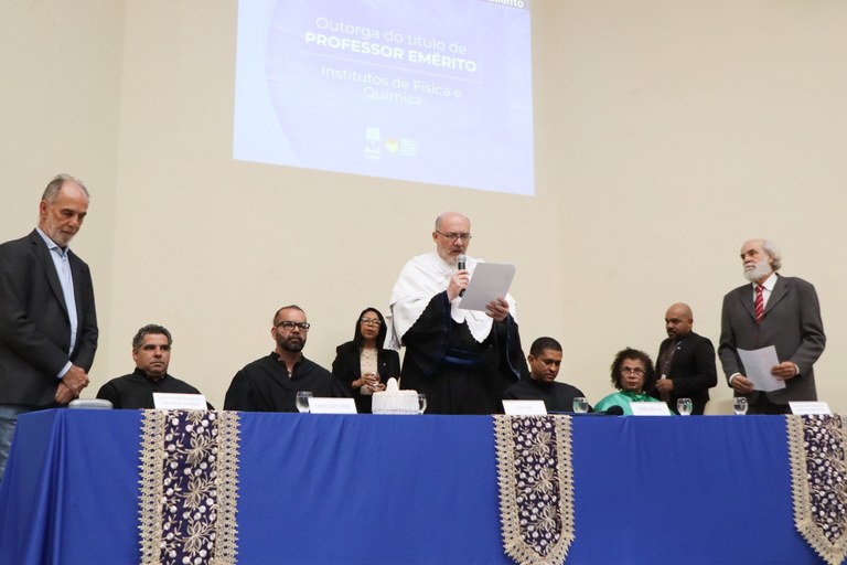 A cerimônia teve início com a leitura dos termos indagativos e das resoluções 115/2024-Consuni/Ufal e nº 121/2024-Consuni/Ufal, referentes aos títulos de Jenner Barretto e Antônio Euzébio. Na sequência, foram lidos os discursos panegíricos, relembrando as contribuições dos docentes à universidade e às suas áreas de conhecimento.