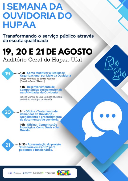 O Hospital Universitário Professor Alberto Antunes (HU) da Universidade Federal de Alagoas (Ufal) realiza, pela primeira vez, a 1ª Semana da Ouvidoria, com a participação de nomes importantes da área. Convidados especialistas de Maceió e da Empresa Brasileira de Serviços Hospitalares (Ebserh), com sede em Brasília, estão confirmadas. O evento ocorre entre os dias 19 e 21 de agosto, no auditório do HU, e os interessados podem realizar a inscrição no primeiro dia do evento, no local de realização.