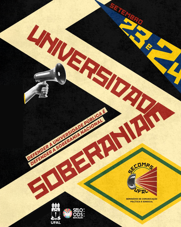 Nos dias 23 e 24 próximos, o curso de Relações Públicas da Universidade Federal de Alagoas (Ufal) irá realizar a primeira edição do Seminário de Comunicação Política e Sindical (Secomps) com o tema “Defender a universidade federal é defender a soberania nacional”. O evento conta com certificado de 25h e as inscrições podem ser feitas pelo Link. A programação inclui mesas-redondas, oficinas e rodas de conversa acerca da comunicação sindical, defesa da universidade pública e soberania nacional.
