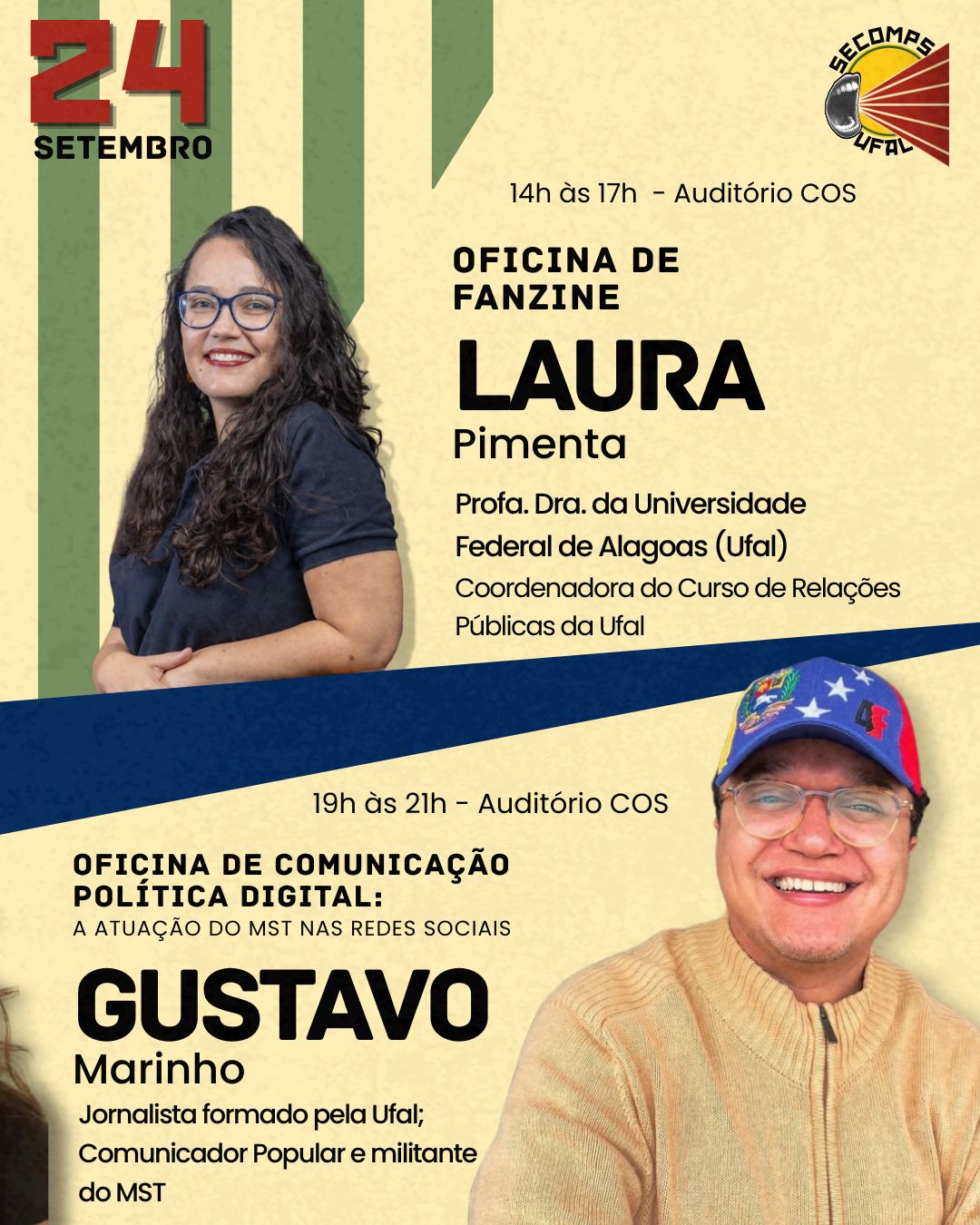 No segundo e último dia (24), a programação segue com a Oficina de Fanzine, ministrada pela professora Laura Pimenta, da Ufal, das 14h às 17h, no COS. Encerrando o dia, das 19h às 21h, ocorre a atividade “Comunicação política digital: a atuação do MST nas redes sociais”, ministrada por Gustavo Marinho, jornalista e comunicador do MST/AL.