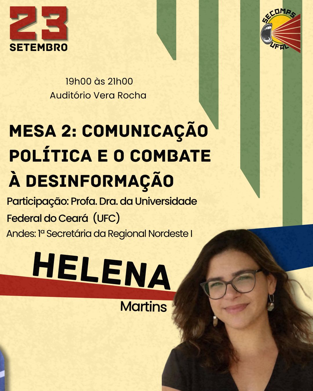 A idealizadora do evento e Professora do curso de Relações Públicas da Ufal, Thainá Martiniano, afirma que o Secomps é um espaço de luta e reflexão sobre a importância da comunicação nas práticas políticas e sindicais: “Diante dos constantes ataques à democracia brasileira, é urgente pensarmos em uma comunicação popular, democrática e comprometida com a transformação social, capaz de fortalecer a soberania nacional e dar voz a todas as camadas da classe trabalhadora e do povo brasileiro.”
