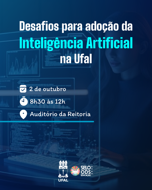 A Universidade Federal de Alagoas (Ufal) promove nesta quinta-feira (2), das 8h30 às 12h, no auditório da Reitoria, em Maceió, o evento ‘Desafios para adoção da Inteligência Artificial na Ufal’. A iniciativa tem como objetivo apresentar experiências de uso dessa tecnologia na educação, além de incentivar o engajamento docente e do servidor técnico-administrativo para a construção coletiva da política institucional de IA da Universidade. O evento é organizado pela Gerência de Capacitação da Pró-reitoria de Gestão de Pessoas e do Trabalho (Progep) e pelo Núcleo de Tecnologia da Informação (NTI), com apoio da Assessoria de Comunicação (Ascom) e da Pró-reitoria de Gestão Institucional (Proginst).