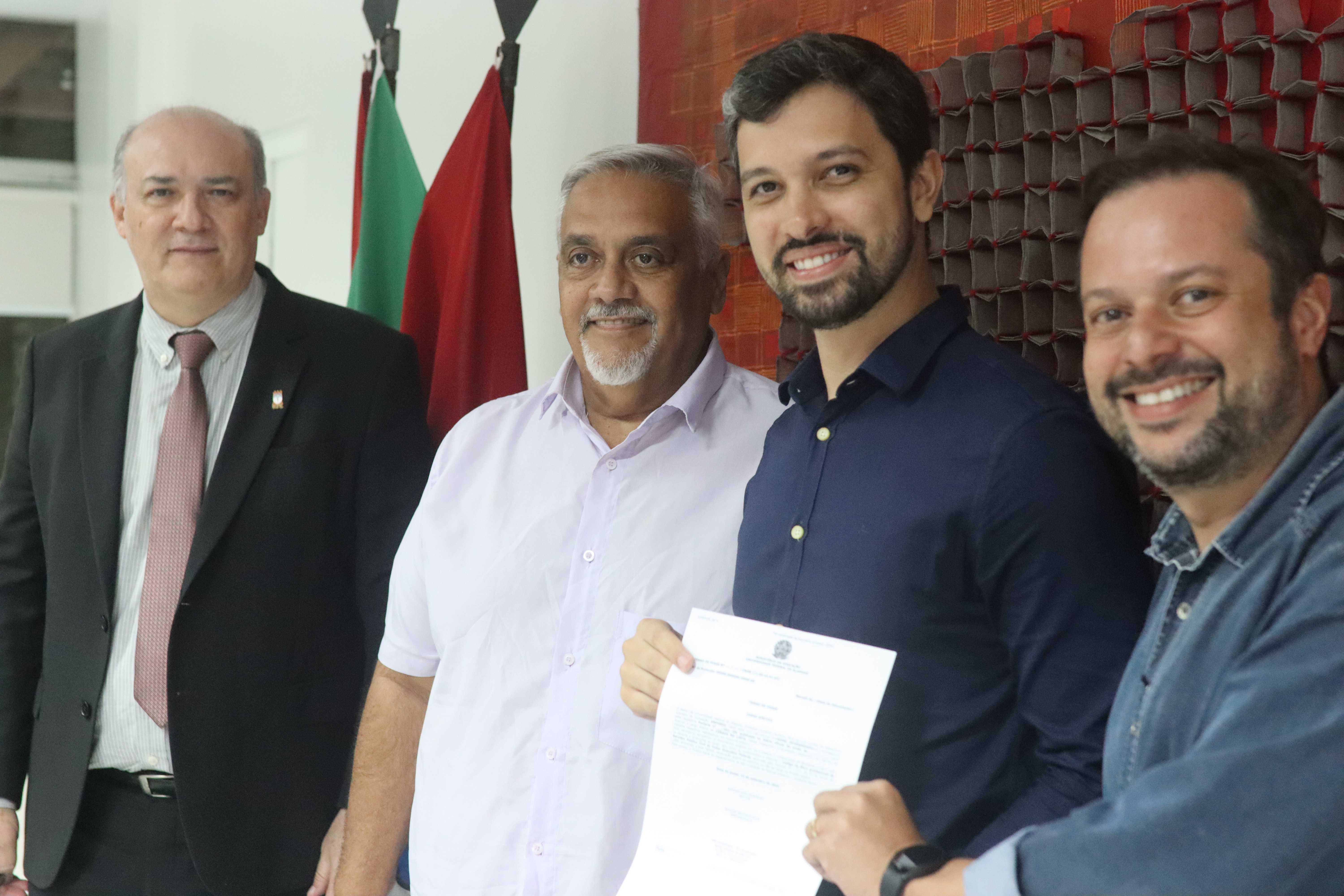 A solenidade de posse de cinco servidores para os segmentos técnico-administrativo e docente da Universidade Federal de Alagoas (Ufal) marcou a rotina de trabalho no gabinete da Reitoria, na última segunda-feira (22). Os novos servidores vão atuar nos campi A. C. Simões, em Maceió, e do Sertão, em Delmiro Gouveia. Presidida pelo reitor Josealdo Tonholo, a solenidade foi prestigiada pelos familiares, por representantes da gestão central, assessoria do Gabinete, de unidades acadêmicas e do Hospital Universitário Professor Alberto Antunes (HU).