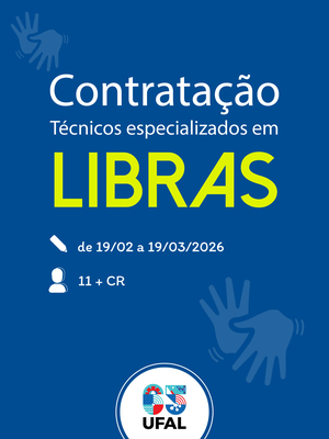 A Universidade Federal de Alagoas (Ufal) publicou o Edital nº 06/2026, para a contratação de técnicos especializados em Língua Brasileira de Sinais (Libras), com 11 vagas imediatas e formação de cadastro de reserva para atuação nos campi A.C. Simões (Maceió), Arapiraca e Sertão, incluindo unidades de ensino vinculadas. As inscrições serão realizadas a partir do dia 19 de fevereiro (quinta-feira), até as 18h do dia 19 de março, exclusivamente pela internet.