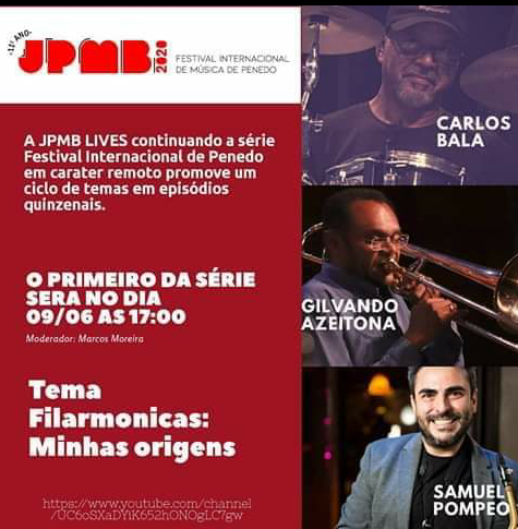 Continuando a série Festival de Música de Penedo em caráter remoto, Carlos Bala, Gilvando Azeitona e Samuel Pompeo se apresentam na tarde desta terça-feira, 9 de junho, a partir das 17h no Youtube, com o tema Filarmônicas: minhas origens. O show faz parte do JPMB lives, uma iniciativa do Festival Internacional de Música de Penedo, que realiza encontros quinzenais com temas diversos.