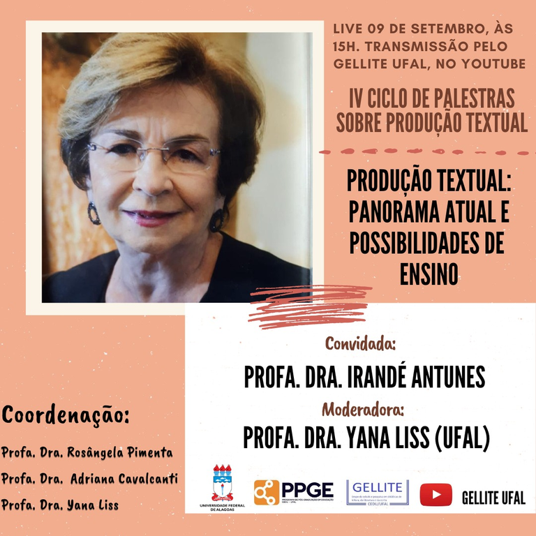 O evento inicia na quarta-feira, 5 de agosto, e finaliza em novembro, com uma palestra por mês. A exibição será realizada pelo canal do Gellite (Grupo de Estudo e Pesquisa em Didáticas de Leitura, da Literatura e da Escrita), no YouTube.