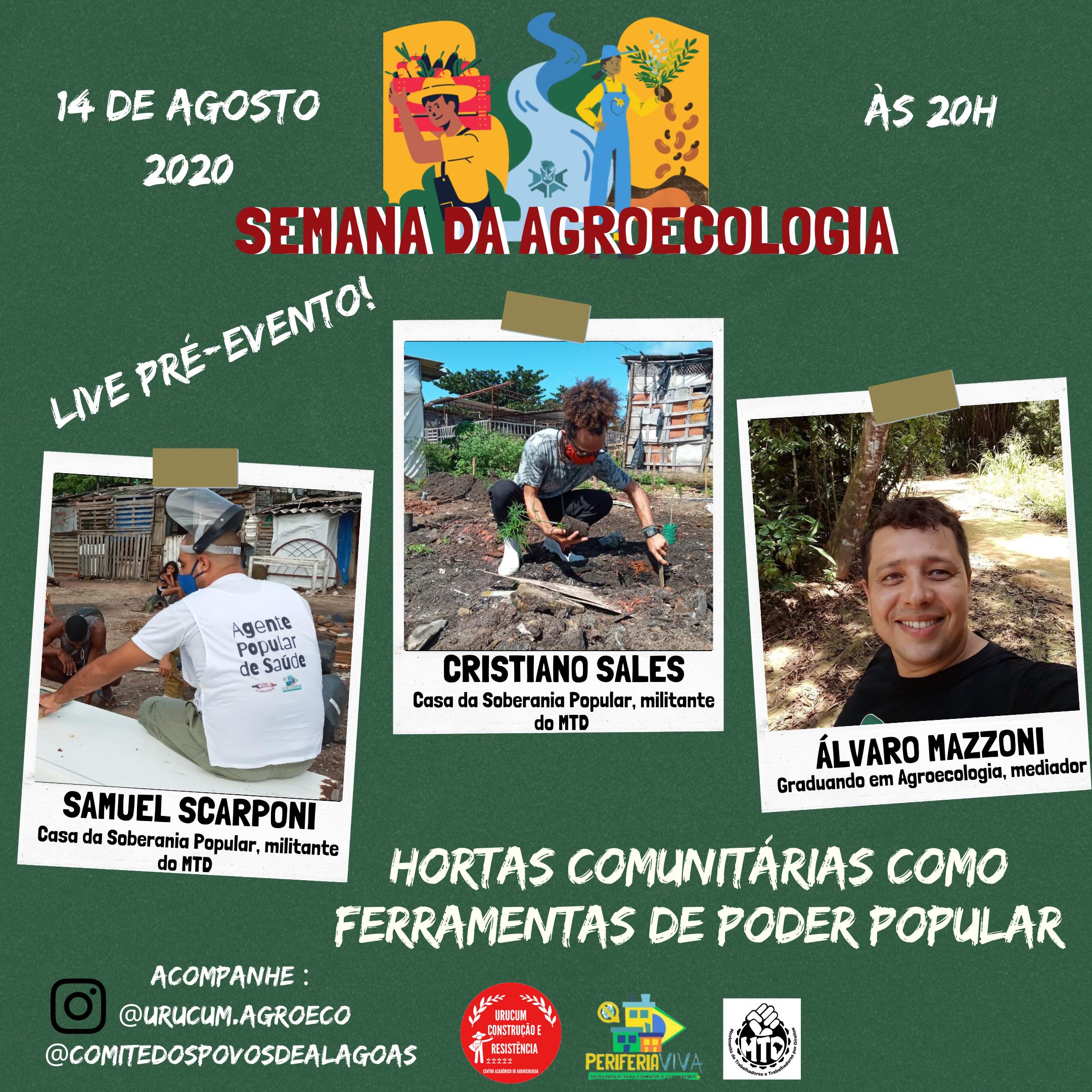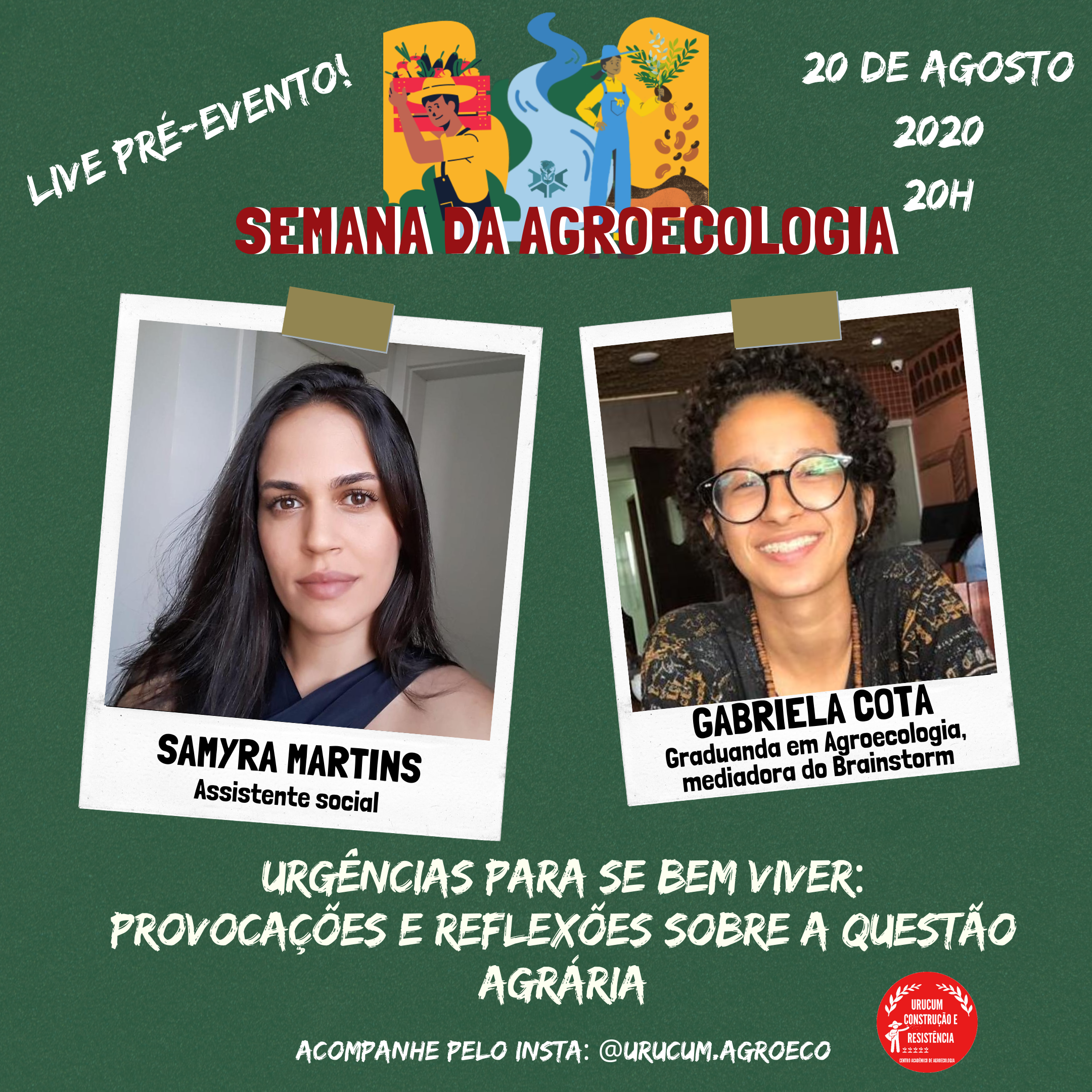 Para participar, acesse o link. Haverá emissão de certificados, enquanto a programação não é divulgada, a comissão realiza um pré-evento, com duas lives nos dias 14 e 20 de agosto (confira programação nas imagens abaixo). Para acompanhar, siga o perfil do Instagram do CA de Agroecologia - Urucum: Construção e Resistência (@urucum.agroeco).
