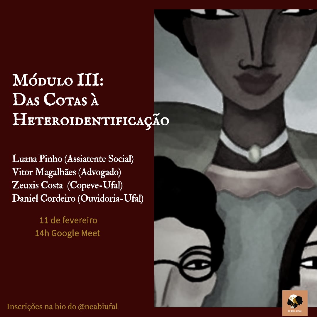 Nos próximos dias 10 e 11 de fevereiro, o Núcleo de Estudos Afro-brasileiros e Indígenas (Neabi) da Ufal promove mais um curso de Promoção da Igualdade Racial e Combate ao Racismo. Aberto a estudantes de nível superior, servidores públicos e membros de movimentos sociais, o curso tem o objetivo de formar avaliadores para as bancas de Heteroidentificação.