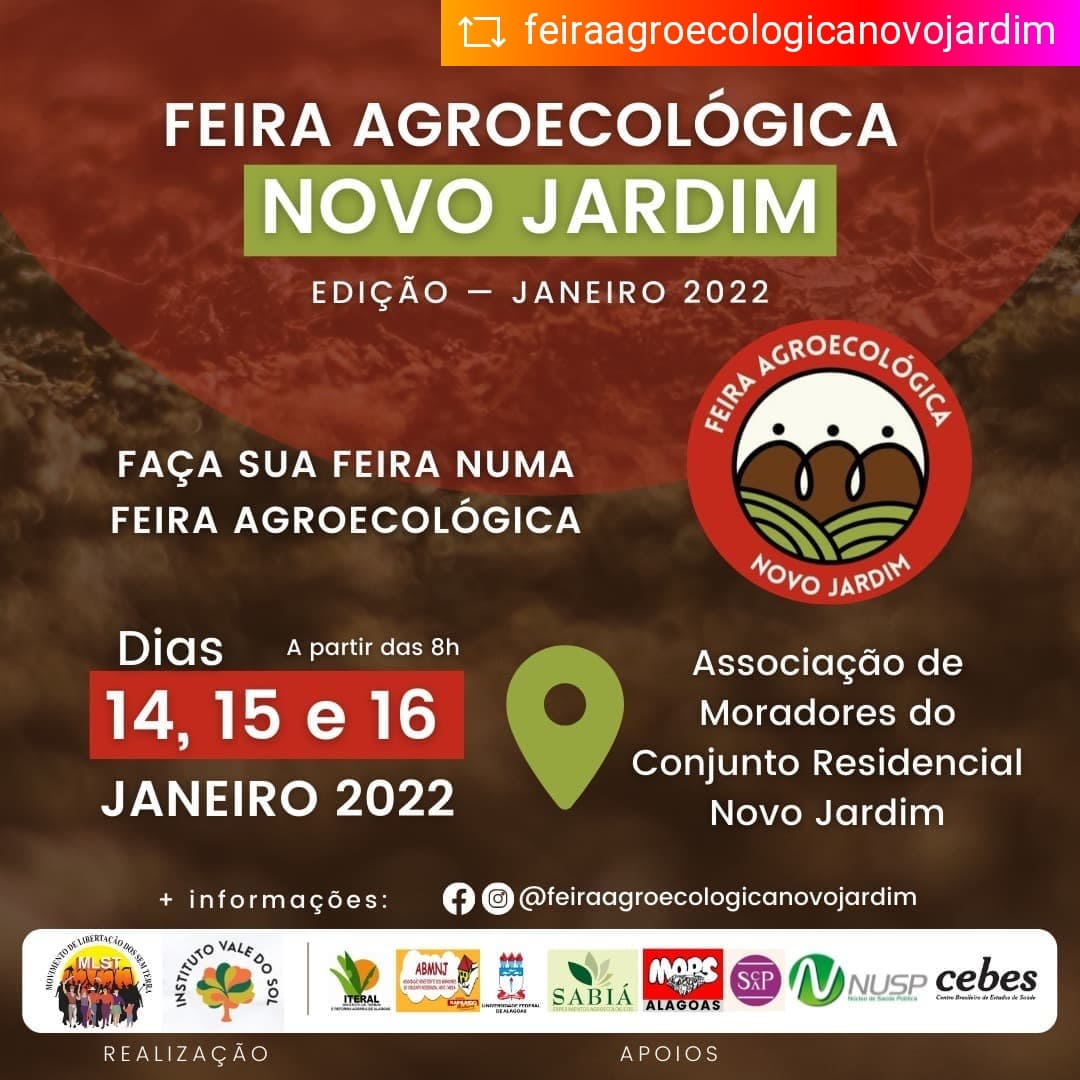 A partir desta sexta-feira (14) até domingo acontece mais uma edição da Feira Agroecológica Novo Jardim, na parte alta da capital. A atividade é uma realização do Instituto Vale do Sol em parceria com o Movimento de Libertação dos Sem Terra (MLST) e conta com o apoio do Instituto de Terras e Reforma Agrária de Alagoas (Iteral), da Universidade Federal de Alagoas, por meio da Pró-reitoria de Extensão, da Associação de Moradores do Conjunto Residencial Novo Jardim, do Movimento Popular de Saúde (Mops-AL), Centro Brasileiro de Estudos de Saúde (Cebes-AL), da Associação Nacional dos Profissionais e Empresas Promotoras de Crédito e Correspondentes no País (Aneps) e do Sistema de Capacitação de Recursos Humanos (Scap).