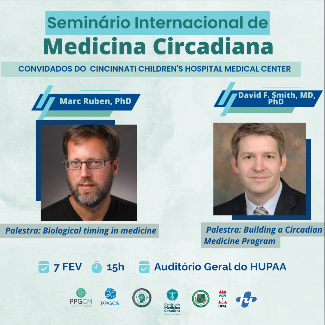 No próximo dia 7 de fevereiro, a partir das 15h, acontece o 1º Seminário Internacional de Medicina Circadiana, no auditório do Hospital Universitário Professor Alberto Antunes (HU). O evento trará os PhDs norte-americanos David F. Smith e Marc Ruben, membros do Centro de Medicina Circadiana do Cincinnati Children's Hospital Medical Center, que ministrarão palestras sobre a construção de um programa de medicina circadiana e o relógio biológico na medicina.
