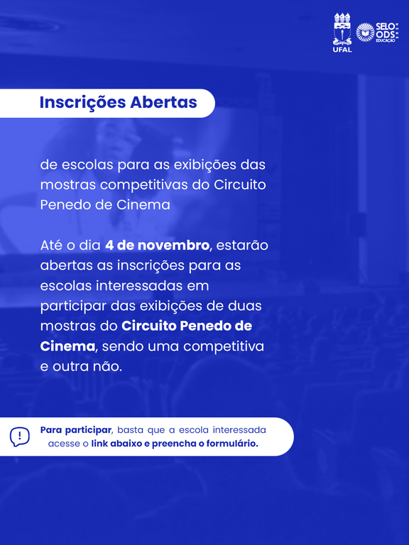 Até o dia 4 de novembro, estão abertas as inscrições para as escolas interessadas em participar das exibições de duas mostras do Circuito Penedo de Cinema, sendo uma competitiva e outra não. As sessões acontecerão nos dias 11, 12 e 13 de novembro, no Centro de Convenções Zeca Peixoto, Centro Histórico da cidade.